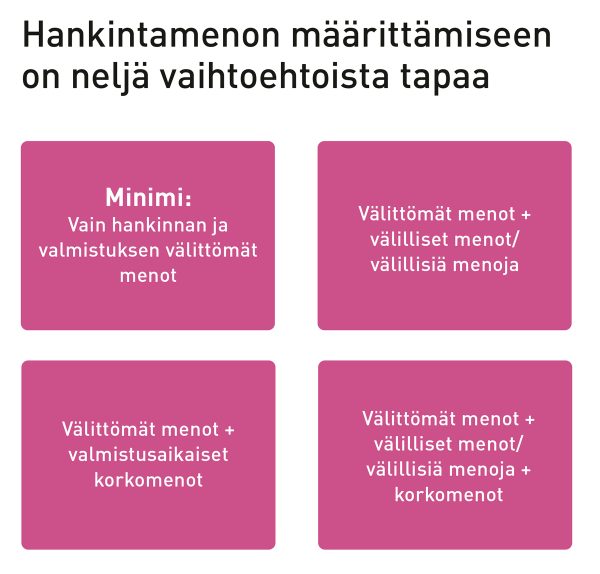 Hankintamenoon luetaan vähintään välittömät menot, mutta voidaan lisätä myös kohtuullinen määrä välillisiä menoja.