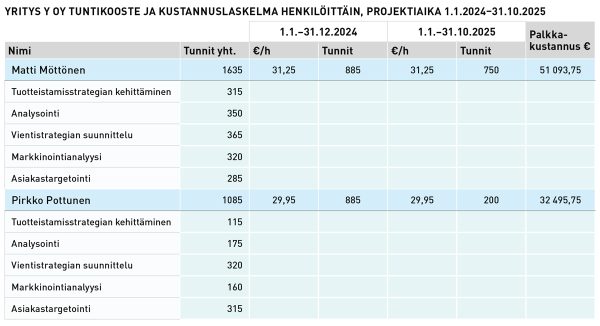 Yritys Y Oy:n kehittämishankkeen tuntiseuranta ja palkkakustannuslaskelma laadittu henkilöittäin alla olevan esimerkin mukaan. Lisäksi aktivointikirjaus todennetaan palkkakirjanpidosta saatavalla tarkemmalla erittelyllä.