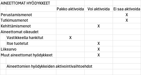 Kun pysyvien vastaavien aineellisten hyödykkeiden aktivointi perustuu kaikilta osin vain tulontuottamiskykyyn, eikä ole riippuvainen hankitun hyödykkeen luonteesta, niin aineettomien hyödykkeiden osalta tilanne on toinen. Aineettomien hyödykkeiden osalta kirjanpitolaki määrittää, onko kyseisen hyödykkeen osalta aktivointi pakolista, mahdollista tai kiellettyä. Jos aktivointi KPL:n mukaan on pakollista tai mahdollista, niin silloin on vaikutusaika otettava huomioon aktivointiaikaa mietittäessä. Vain useampana, siis vaikka kahtena tilikautena tuloa tuottavat aineettomat oikeudet voi aktivoida. Aktivointiin liittyy varsinkin aineettomien erien valinnaisten aktivointien kohdalla varovaisuuden periaatteen korostuminen.