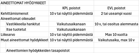 Pysyvien vastaavien aineettomista eristä kirjataan tilikausittain kuluksi laaditun poistosuunnitelman mukainen tasapoisto. Vastikkeellisesti hankittujen aineettomien oikeuksien kohdalla vaikutusaika on yleensä tiedossa ja se on silloin myös poistoaika. Itse tuotettujen vastaavien erin poistoaika on niiden arvioitu vaikutusaika, jolle laki ei aseta minimi- tai maksimivuosimäärää. Muiden pitkävaikutteisten menojen osalta poistui 1.1.2016 alkaen viiden vuoden yleinen poistoaika ja 20 vuoden maksimipoistoaika. Nyt muiden aineettomien hyödykkeiden yleinen poistoaika on 10 vuotta, mutta luotettavalla arviolla aika voi olla pidempikin, maksimiaikaa laki ei enää määritä. EVL noudattaa näiden erien osalta 10 vuoden maksimipoistoaikaa, kehittämismenoja lukuun ottamatta. Pääsääntöisesti aineettomien erien poistoaika alkaa heti, kun menoja on syntynyt.