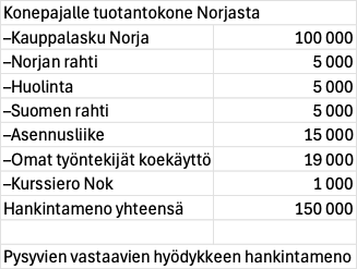 Kun kyseessä on yrityksen hankkimasta yksittäisestä hyödykkeestä, koneesta tai laitteesta, muodostuu sen hankintameno yleensä vain välittömistä menoista. Tärkeää on tunnistaa, mitkä menot ovat noita hankinnasta aiheutuneita välittömiä menoja, jotka tulee lukea hankintamenoon, eikä kirjata vuosikuluna. Alla on esimerkki hankintamenosta, joka koostuu useasta erillisestä välittömästä menosta. Riskinä on, että kaikkia noita eriä ei tunnisteta osaksi hankintamenoa, vaan ne päätyvät vuosikuluksi.