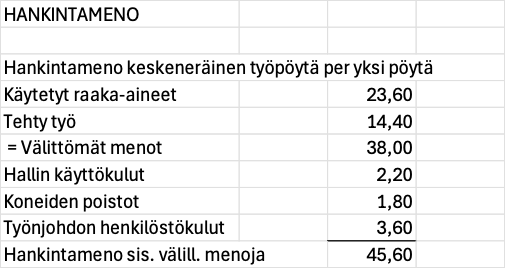 Yleisohjeen laadinnan jälkeen on myös korkojen aktivoinnin osalta laajennettu KPL:ssä kohteita, joihin korkoja voi aktivoida. Enää kyse ei ole vain pysyviin vastaaviin luettavan hyödykkeen valmistusaikaisista korkomenoista, vaan korkojen aktivointi voi kohdistua myös yrityksen valmistamaan vaihto-omaisuuteen luettavaan hyödykkeeseen, esimerkiksi rakennusurakkaan tai suureen koneyksikköön. Tällä mahdollisuudella voi olla iso merkitys esimerkiksi sellaiselle rakennusliikkeelle, jolla on yksi työmaa menossa kerrallaan ja toimitaan vieraalla pääomalla. Alla on esimerkki hankintamenon laskennasta, kun mukaan otetaan myös välillisiä kuluja.