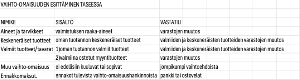 Tilikaudella vaihto-omaisuuden hankinta käsitellään PMA:n kululajikohtaisen tuloslaskelmakaavan kohdassa 5. Materiaalit ja palvelut, sen alakohdassa a) Aineet, tarvikkeet ja tavarat. Tilikauden päättyessä inventoidaan jäljellä ole vaihto-omaisuus ja arvioidaan sen tuleva tulontuottamiskyky. Suositeltavaa on inventoida ensin koko vaihto-omaisuus ja sen jälkeen tehdä oma luettelo tai sarake arvonalennuskirjauksille eli epäkuranteille hyödykkeille. Olennaista tilinpäätöksen antaman kuvan kannalta on käsitellä vaihto-omaisuus ja sen muutokset oikeilla asetuksen mukaisilla riveillä taseessa ja tuloslaskelmassa. Alla oleva taulukko havainnollistaa asiaa.