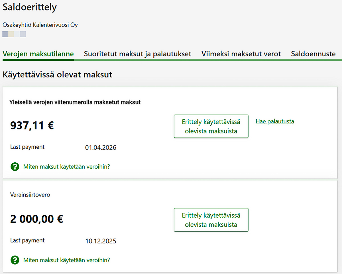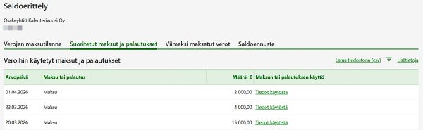 Jos maksua ei ole vielä käytetty veroihin, saldo näkyy positiivisena. Erittelystä voi tarkastella käytettävissä olevia maksuja yksitellen. Maksua voi myös pyytää palautettavaksi.