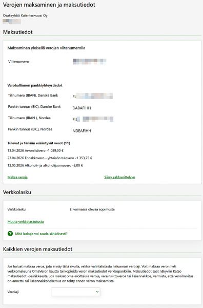 Verojen maksaminen ja maksutiedot -näkymässä (kuva 1) näytetään yleinen verojen viitenumero, Verohallinnon pankkiyhteystiedot sekä erääntyneet ja tulevat verot. Näkymässä olevien linkkien kautta voi siirtyä maksamaan veroja tai tarkastelemaan tapahtumia saldoerittelyltä. Myös verkkolaskusopimuksen tiedot sekä verolajikohtaiset viitenumerot ovat saatavilla Verojen maksaminen ja maksutiedot -näkymältä.