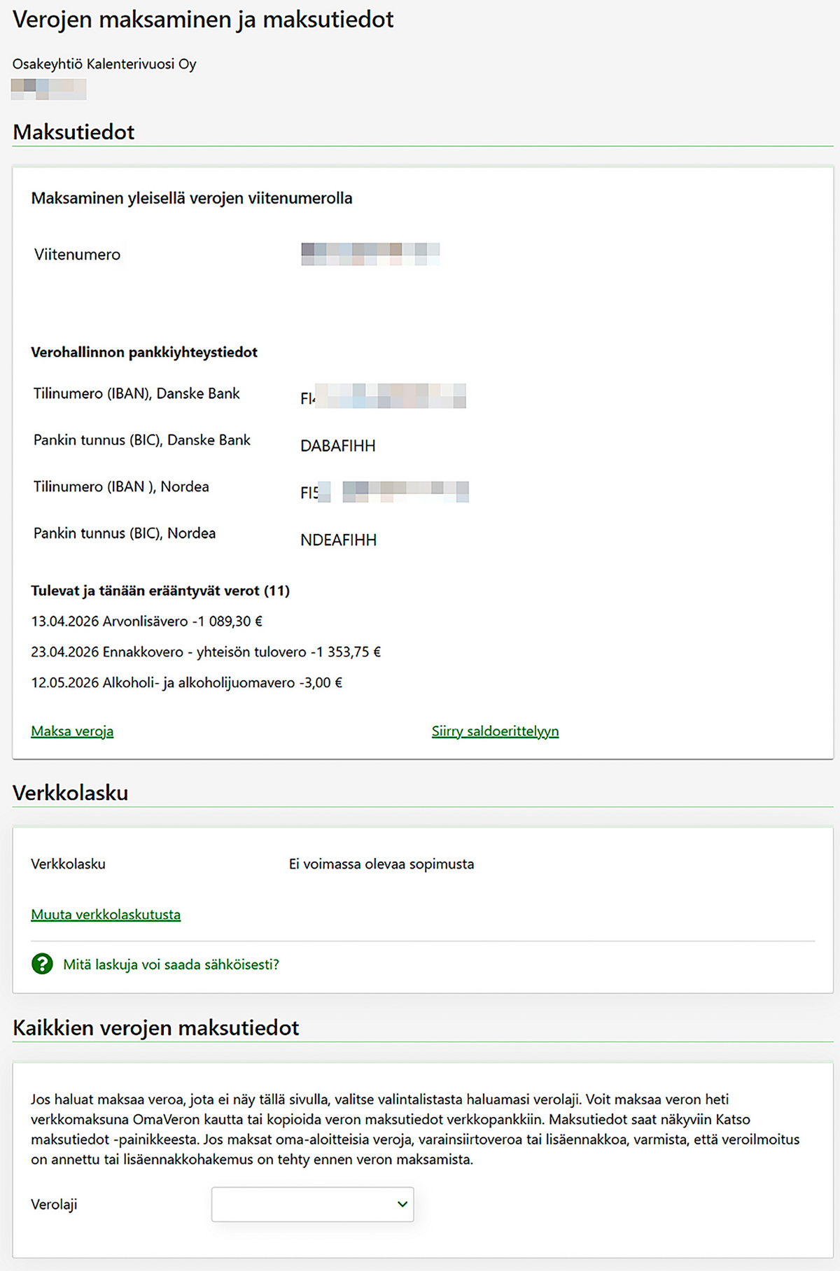 Verojen maksutilanne -välilehdeltä käyttäjä näkee käytettävissä olevat maksut eriteltyinä sen mukaan, millä viitenumerolla maksu on suoritettu. Yleisen verojen viitenumerolla maksettuja maksuja koskevan paneelin lisäksi sivulla voi asiakkaan tilanteesta riippuen näkyä myös seuraavat verolajikohtaiset paneelit: