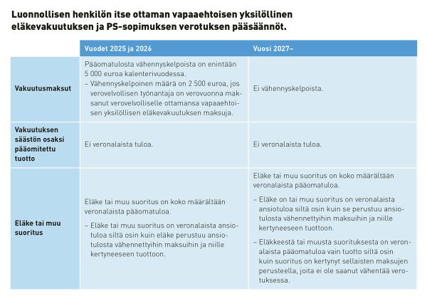 Luonnollisen henkilön maksamat vapaaehtoisen eläkevakuutuksen maksut ovat viimeisen kerran vähennyskelpoisia vuoden 2026 verotuksessa. Vuoden 2027 alusta lähtien maksetut maksut ovat vähennyskelvottomia. Maksujen perusteella ei voi myöskään saada erityistä alijäämähyvitystä. Samat periaatteet koskevat PS-sopimuksen maksuja.